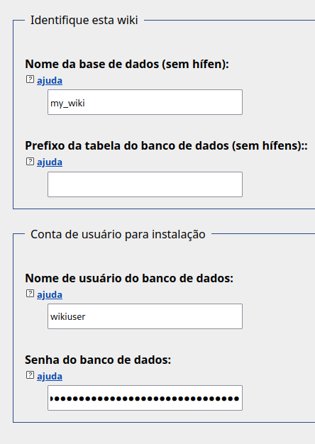 Você pode agora acessar wiki.exemplo.org e continuar a instalação por lá. A Primeira tela vai te pedir para escolher uma linguagem, escolha "pt-br" a menos que queira outra. Ao chegar na seção "Conectar ao banco de dados", aonde pede o nome da base de dados, digite o nome do banco de dados que você criou acima, no meu caso, my_wiki. Na parte "Conta de usuário para instalação", escreva o nome e senha para o usuário que você criou acima, no meu caso, o usuário é wikiuser. Sua tela vai ficar mais ou menos assim.